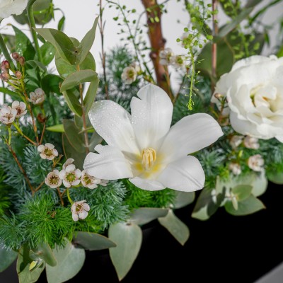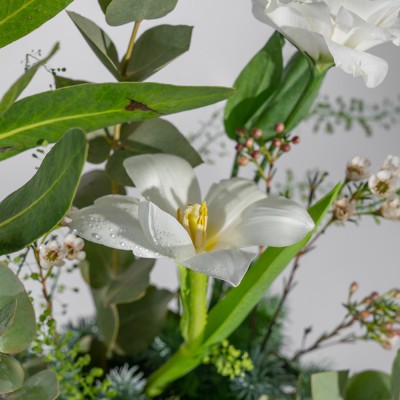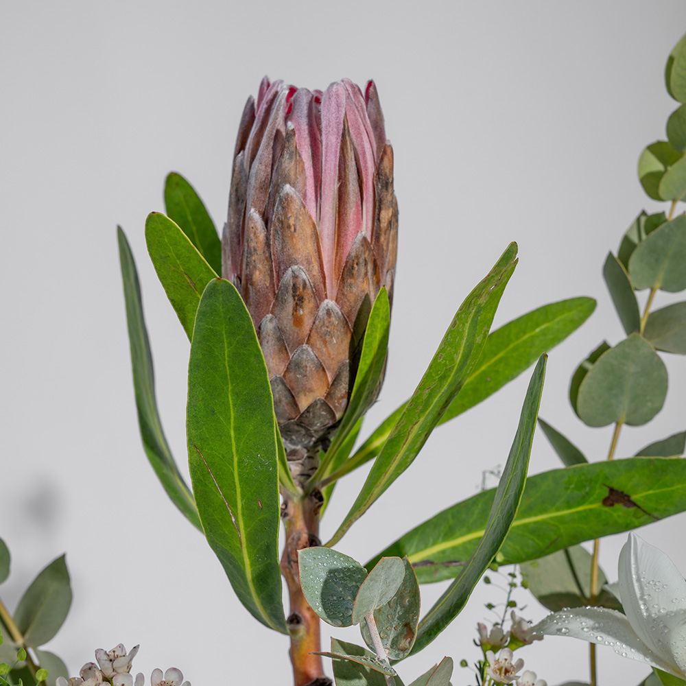 Protea, tulip, lisianthus, wax, lepidium, eucalyptus, asparagus and chocolate