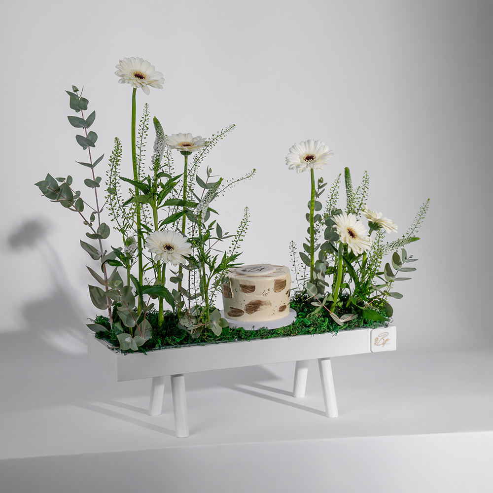 Gerbera, Veronica, Lepidium, Eucalyptus, Moss and Cake