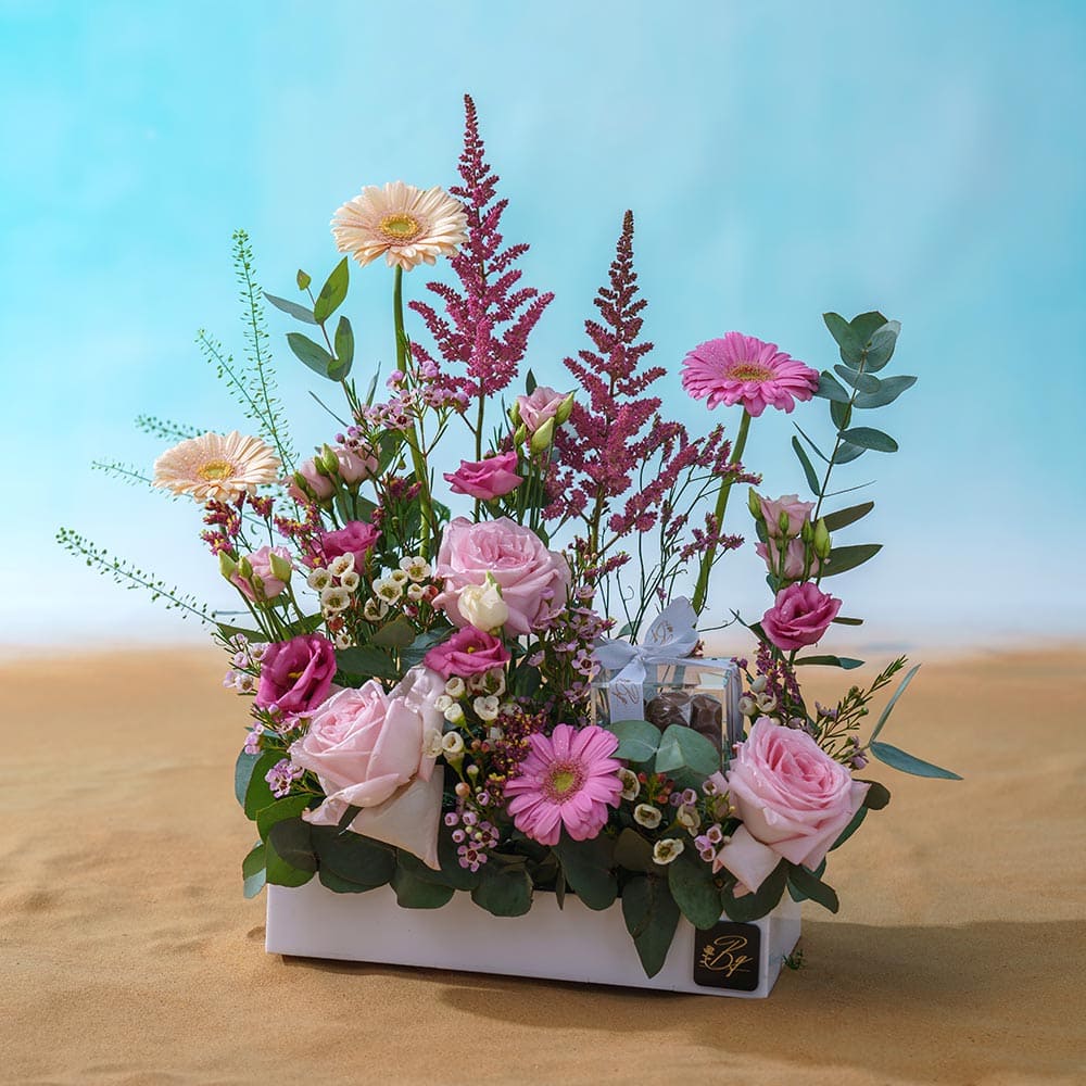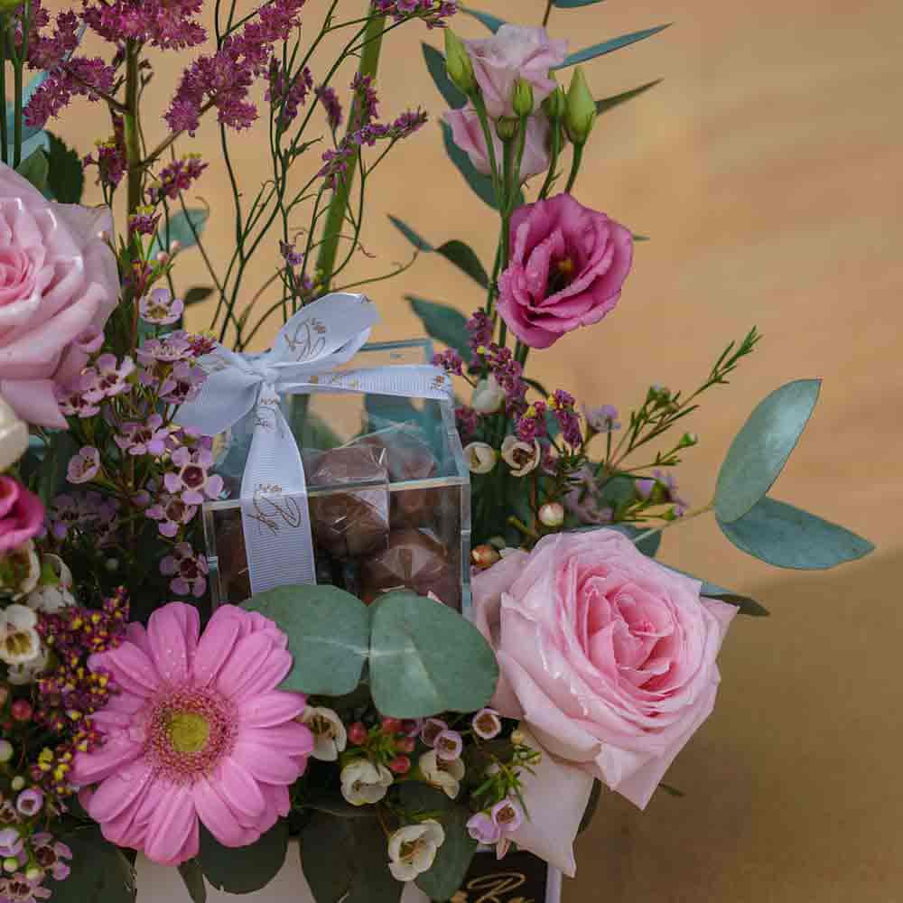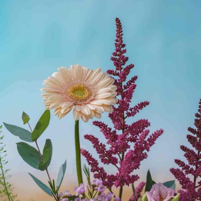 Gerbera, astilbe, ohara rose, lisianthus, wax, limonium, lepidium and eucalyptus