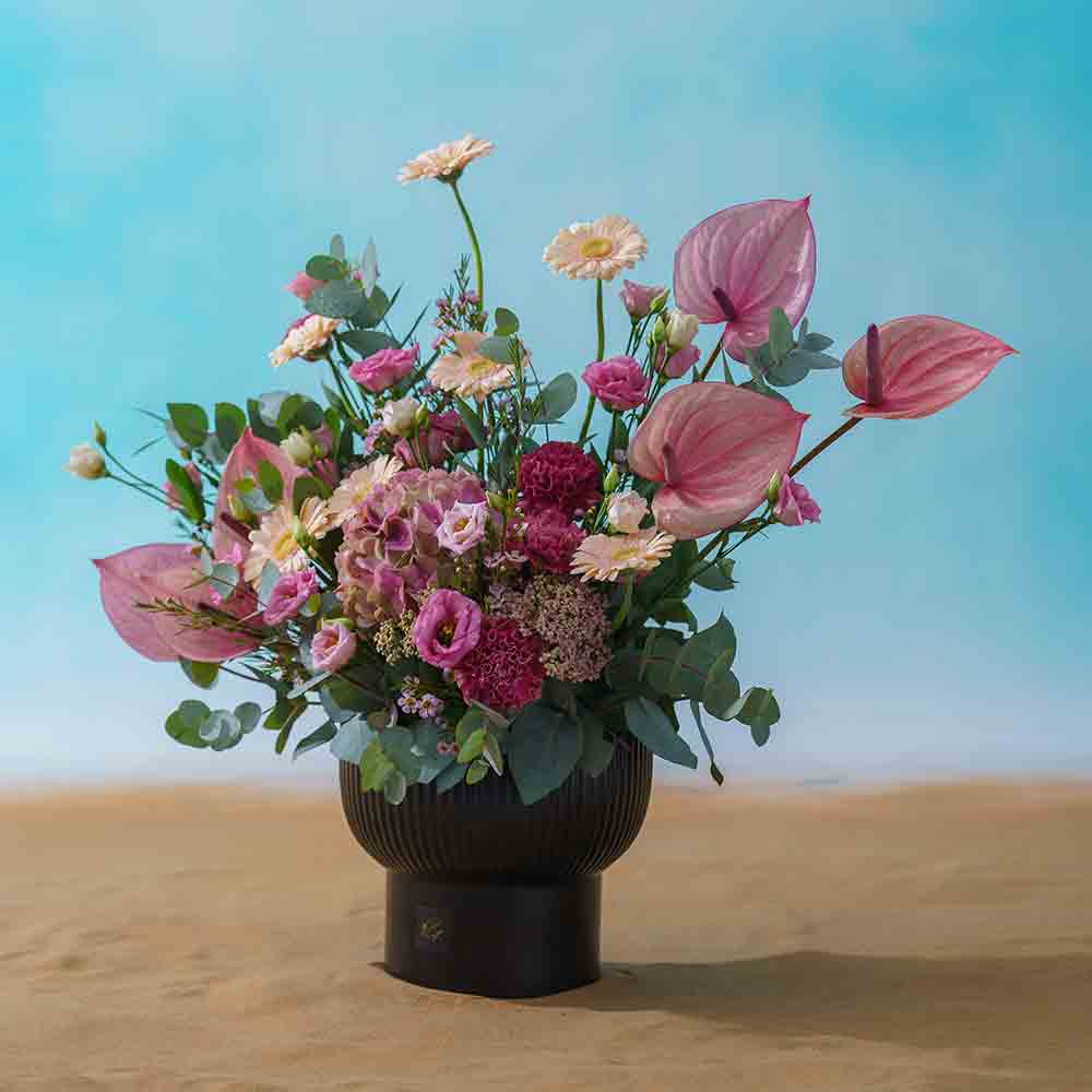 Hydrangea, gerbera, anthurium, lisianthus, sedum, wax and eucalyptuus