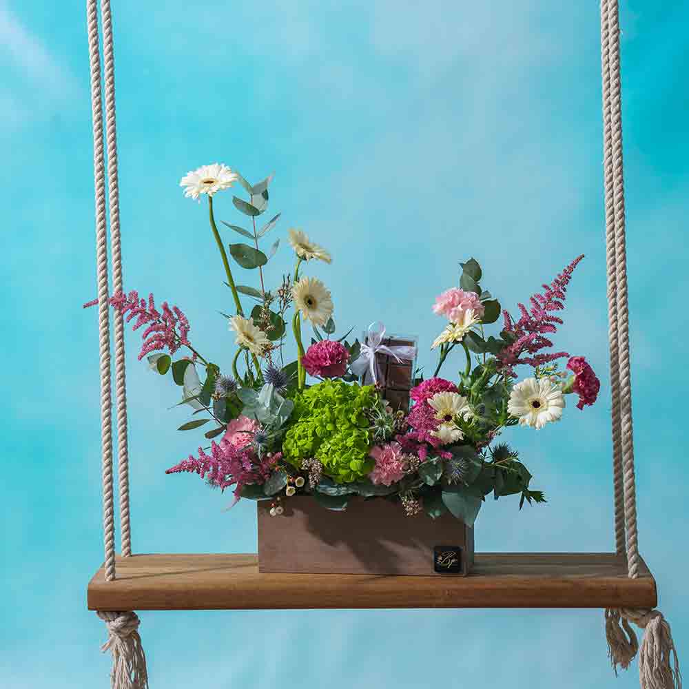 Hydrangea, gerbera, astilbe, carnation, Eryngium, sedum, wax, dried flower and eucalyptus